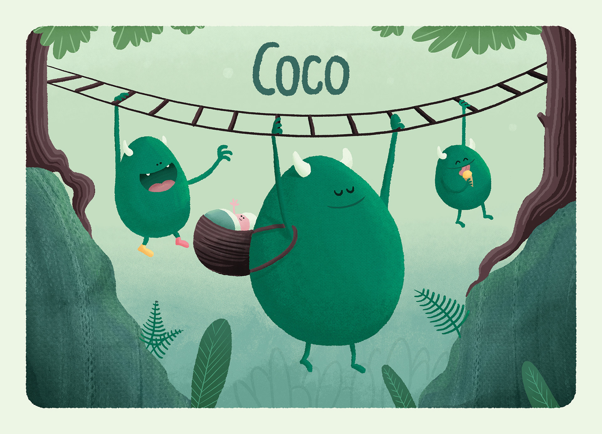 Een liggend geboortekaartje met vrolijke monstertjes op weg naar avontuur!